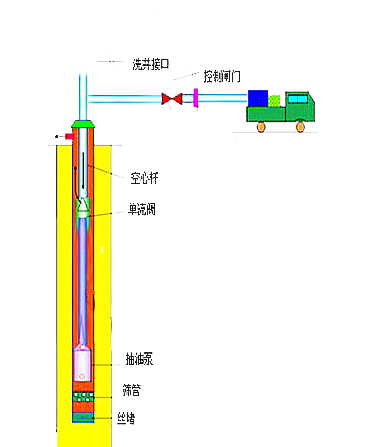 特征:將洗井裝置從油井的井口下入油管中;洗井裝置從油井井口自上至下是抽油桿懸繩器短節(jié)、空心桿兩通、空心桿光桿、空心抽油桿、洗井單流閥、抽油桿、抽油泵柱塞。抽油桿懸繩器短節(jié)與空心桿兩通之間螺紋連接、空心桿兩通與空心桿光桿之間螺紋連接、空心桿光桿與空心抽油桿之間螺紋連接、空心抽油桿與洗井單流閥之間螺紋連接、洗井單流閥與抽油桿之間螺紋連接、抽油桿與抽油泵柱塞之間螺紋連接。